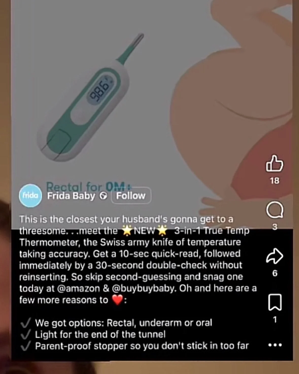 "This is the closest your husband’s gonna get to a threesome," captioning a child’s three-in-one thermometer.